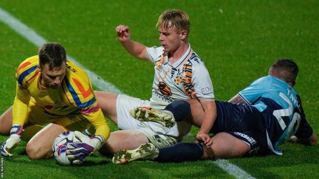 2023 10 31 Cambridge SBL1 H 43a nearly own goal Kieran Sadlier+Liam Bennett
